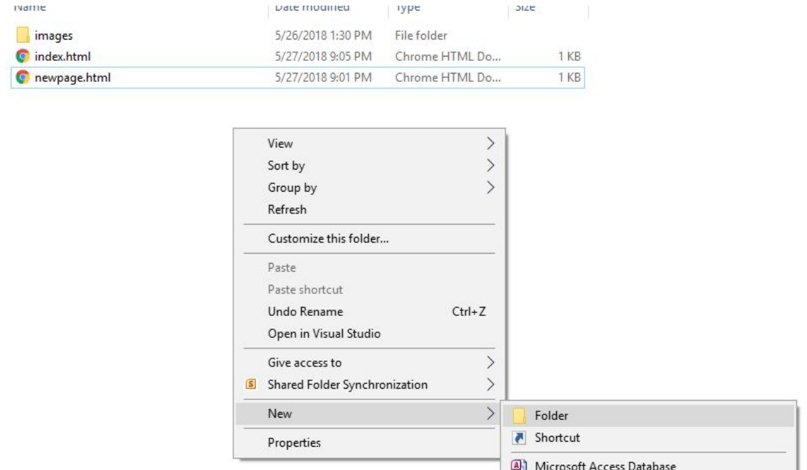 Go to your project folder, right click and create a new text file and call it "newpage.html".